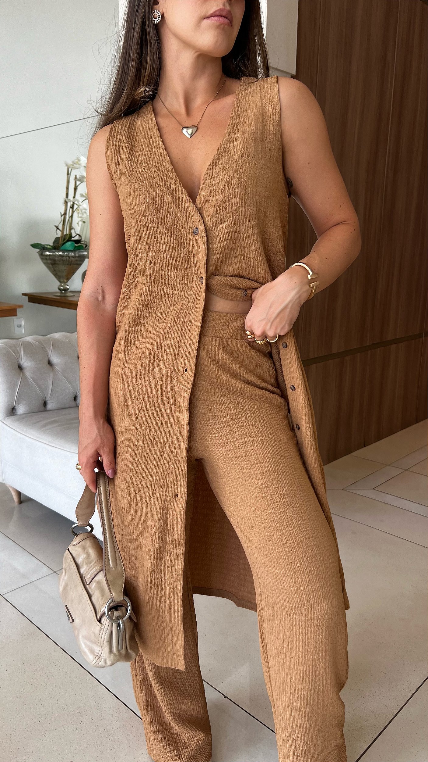 Modelo veste tamanho P/36 da Calça.