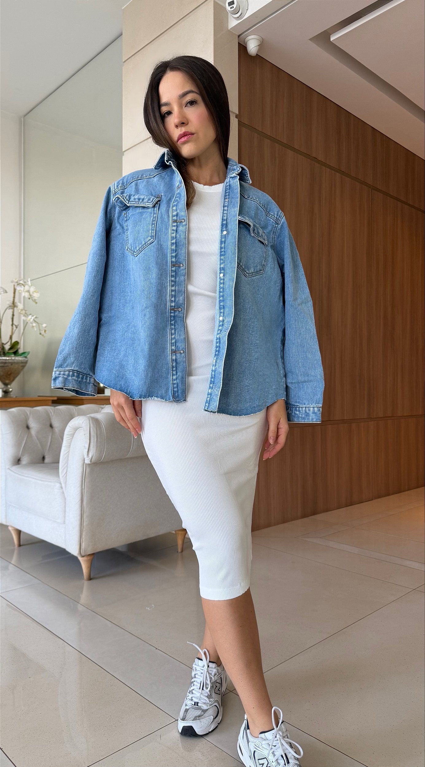 Jaqueta jeans modelo reto e mais longo. Padronagem grossa do jeans. Modelo possuí botões no punho. Barra fio. Tecido com elastano.