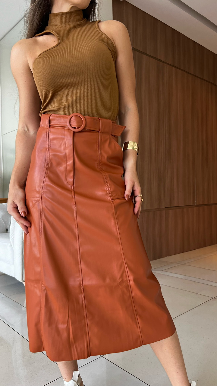Blusa regata com cava mais profunda e gola alta, modelo justo ao corpo.