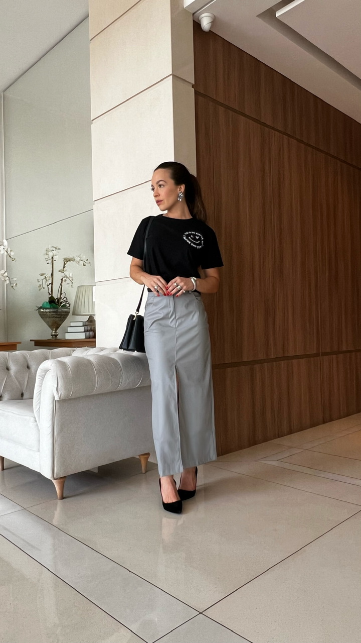 Saia longa em PU, modelo com cós e passante para cinto, fechamento em botão cromado externo e ziper, possui fenda na parte da frente e bolsos na parte da frente.