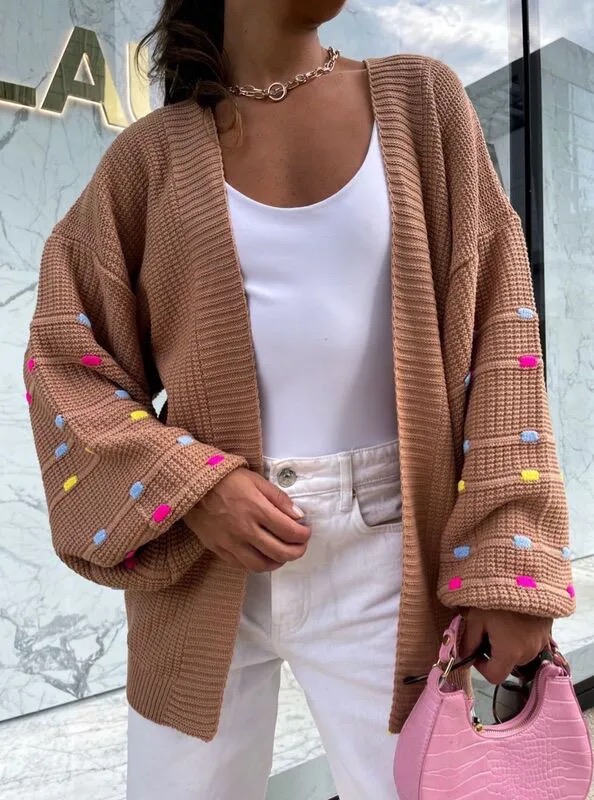 Cardigan modelo oversized, sem botões, possui manga ampla e longa com punho ajustado.
