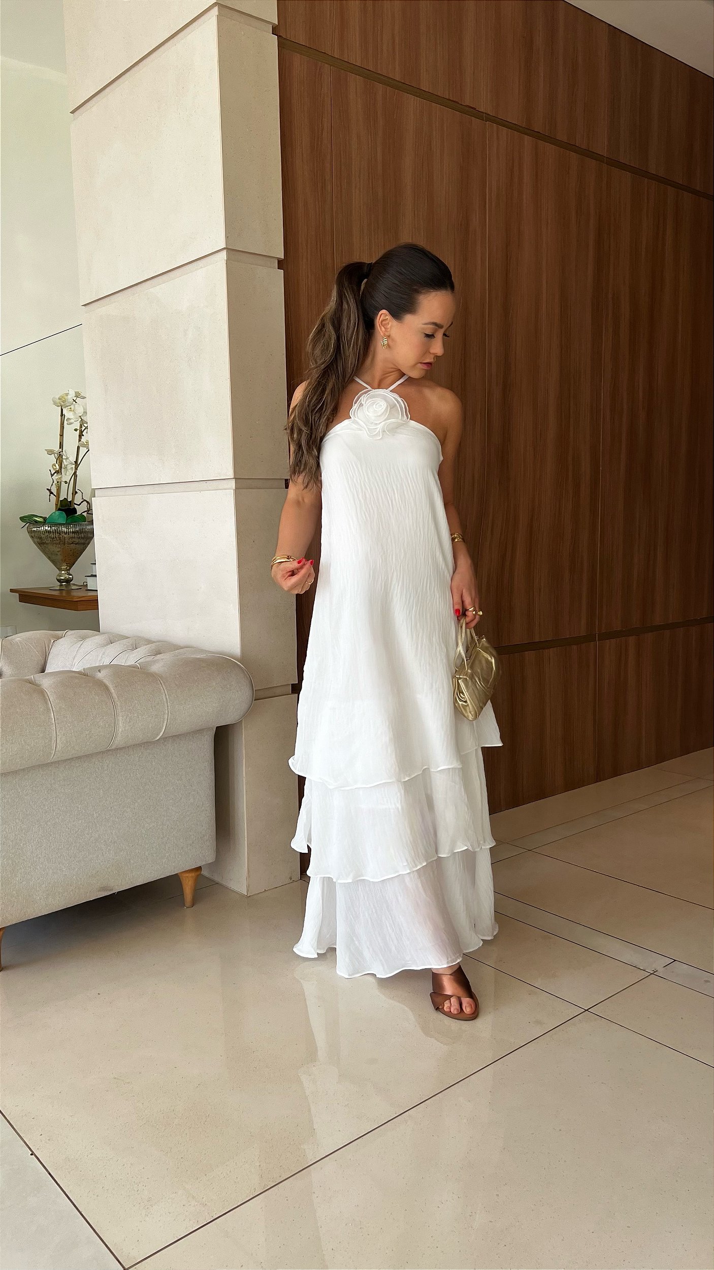 Vestido longo, decote com amarração na parte de trás, possui zíper na lateral, modelagem acinturada e detalhe em camadas de tecido na parte da saia, acompanha cinto de flor. Tecido com forro. Modelagem busto menor para os tamanhos.